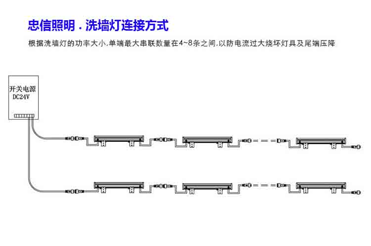 二:將燈具與電源線連接牢固,不用的線頭用防水膠帶包好;在安裝接線時(shí)洗墻燈串聯(lián)數(shù)量保持在5~6條左右,以防串聯(lián)較多時(shí)后端壓降大(詳見(jiàn)下面的示意圖);